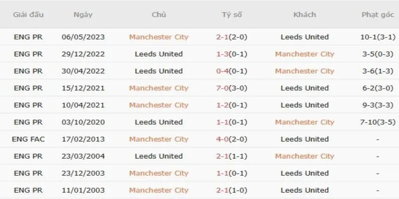 Thành tích đối đầu quá khứ giữa Man City vs Leeds United